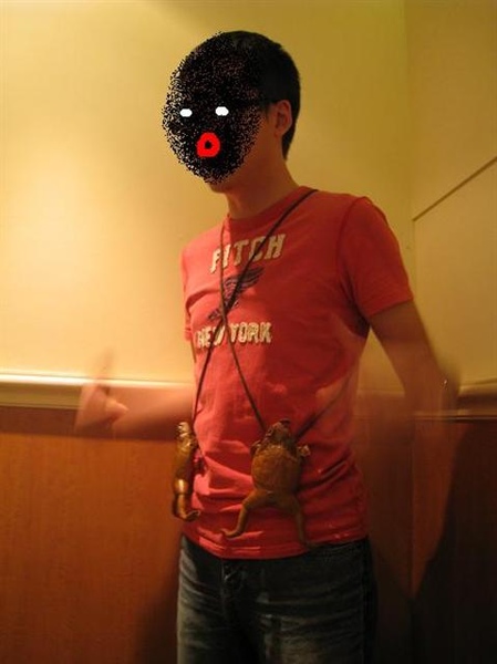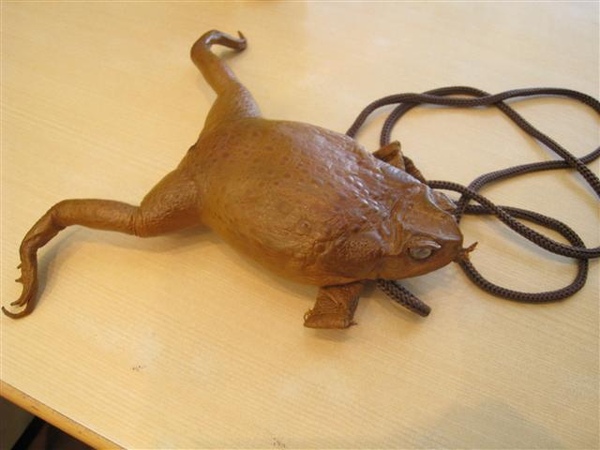 我這輩子收過很多奇趣的紀念品、生日禮物之類的,像是墨西哥小怪物或是群魔亂舞T之類的玩意兒,我以為我的搞怪極限已經夠破表了,沒想到不久前鐵公子去了一趟長灘島,回來後說有照了一張照片獨家獻給我(如下圖),我看完後整個崩潰大驚喜!!!! 一直驚呼「怎麼會有這麼時尚的蟾蜍包!!!!!!」!!!!!!!!!! (← 再多的驚嘆號都無法表達我當時的讚嘆!!!!!)