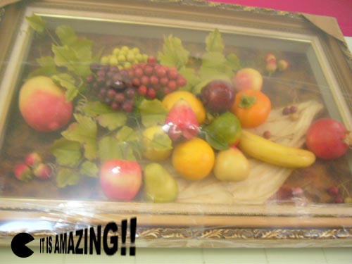 轉述該網友的描述:「親戚家看到"超立體"的畫,近看嚇一跳還真的給我把水果貼上去!!!」,相當大膽又寫實的創意風格!!!! 我要力挺它去紐約MOMA參展!!!!