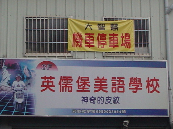 這尊莫名其妙的招牌讓自以為無厘頭到無法無天的我都感到一頭霧水!!! 揪~竟~這間英語教室跟圖中的機車還有副標題"神奇的皮紋"有什麼微妙的關聯啊!!!?? 各位看倌可以幫忙協助破案一下嗎??? (我在猜可能有跟上面那個"大智慧機車停車場"有不可告人的異業結盟!!!!)