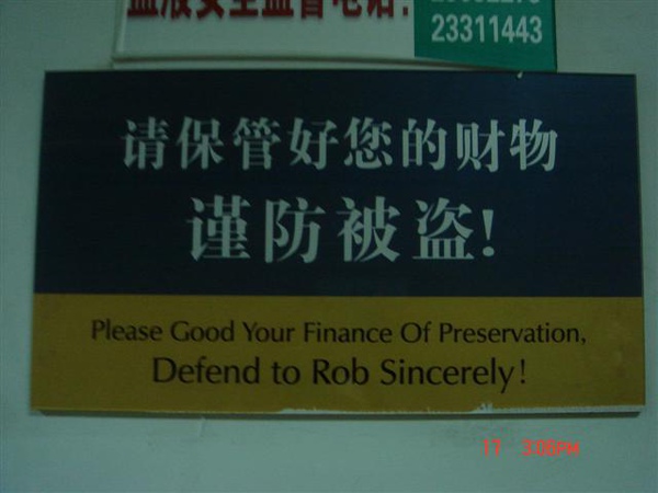 ※ ("ㄛ八桑"提供) 大陸朋友的英文直譯功夫真是俏皮到我心坎裡去了~~ "Defend to rob sincerely!!!!" YOURS SINCERELY!!!!!