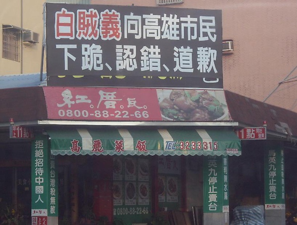 ※ 「下跪! 認錯! 道歉!」、「拒絕招待中國人」、「停止追殺陳水扁」、「馬英九停止賣台」!!!! 太勁爆了~~~ 藍營民眾進去用餐請低調~~免得被毒死~~~
