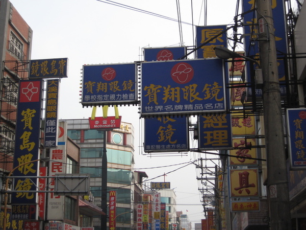 最後推薦一張道路奇景照片,左方是大溪的寶島眼鏡,右方擺明是要來跟寶島眼鏡嗆聲的,不但命名類似、商標雷同,招牌還很欠揍的往外延伸好幾個方格,幾乎就要把魔爪跨越到對面去,還有「原寶島眼鏡經理」的大型告示,逼得左方寶島眼鏡不得不再生一個「大溪寶島眼鏡僅此一家」的招牌來抗衡!(細心的朋友應該可以注意到遙遠的後方還有一家寶宏眼鏡,也是來踢館的一例...= =)