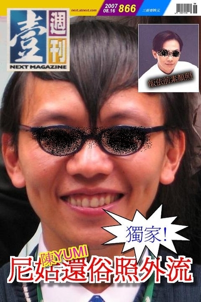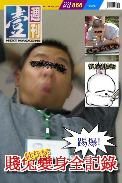 壹周刊的下集在各位讀者熱情的支持下終於出刊了!(燒~~~~) 這系列的壹周刊番外版更勇於揭發社會黑暗面,希望大家在恥笑的同時,能給予這些上了封面的人物些微的關懷。愛心捐款帳號請洽我,謝謝!另外,由於上集有人反映螞蟻般的噴點相當驚悚,於是本集特別上了正宗的馬賽克,希望受害的同事都要勇敢的活下去!(以下各圖版權屬於原作者,但不是都我作的,罪孽要一起分擔.....)